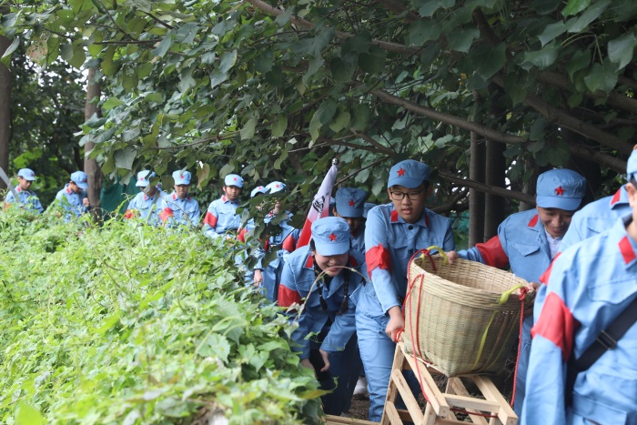 達(dá)到指定地點(diǎn)后,學(xué)生和家長(zhǎng)們迅速換好軍裝,整理好隊(duì)形,斗志昂揚(yáng)地參加研學(xué)的第一項(xiàng)活動(dòng)“重走長(zhǎng)征路”。此項(xiàng)活動(dòng),由學(xué)生和家長(zhǎng)合力組成4路縱隊(duì),“重走長(zhǎng)征路”,體驗(yàn)長(zhǎng)征途中紅軍運(yùn)送物資的艱辛。緊接著,以家庭為單位開(kāi)展“編草鞋”的有趣活動(dòng)。通過(guò)兩項(xiàng)活動(dòng),大家意識(shí)到紅軍在物質(zhì)資源極度匱乏的情況下長(zhǎng)征的艱辛和困苦。