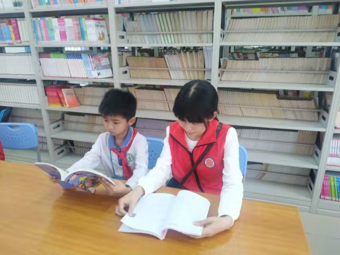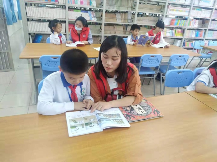 大手拉小手,小小的身影后面跟著一位笑容滿面的家長,兩人從容不迫地走進(jìn)學(xué)校的圖書館。她們雙眼炯炯有神地盯著書架上整齊有序的書本,雙手輕撫書本,最后一人捧著一本自己喜愛的書安靜地坐下。一對(duì)對(duì)親子各自認(rèn)真地閱讀,媽媽時(shí)不時(shí)向女兒介紹黨的成長之路,女兒時(shí)不時(shí)皺著眉頭輕聲向母親提問,兒子時(shí)不時(shí)給媽媽普及軍事知識(shí)。溫情又和諧的一幕,令人倍感美好。隨著時(shí)間的流逝,進(jìn)入圖書館的學(xué)生與家長越來越多,然而現(xiàn)場并沒有因?yàn)槿硕喽鵁狒[,每一對(duì)親子都安靜地閱讀著手中的書本,輕聲交流心得。