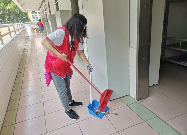 為了給隔離人員提供舒適的隔離環(huán)境,負責宿舍整理的志愿者進入宿舍馬上動手把室內外的衛(wèi)生打掃干凈,再到物資集中點把各種物資搬運到樓上,擺放得美觀整齊。