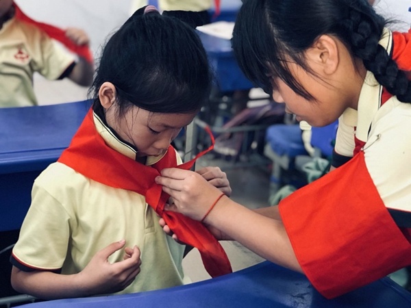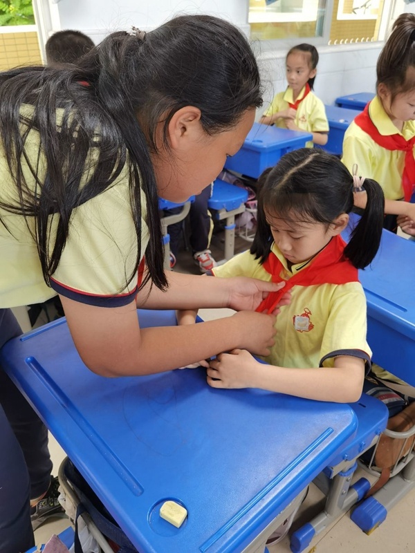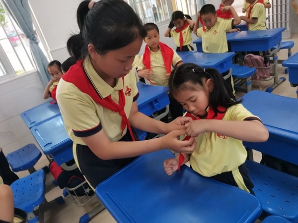 大隊委員們耐心地講解了中國少先隊組織機構、發(fā)展過程和歷史貢獻。詳細講解了“六知六會一做”的知識,并且手把手的一年級的弟弟妹妹們敬隊禮,佩戴紅領巾,學唱少年先鋒隊隊歌,如何宣誓和呼號等,一年級的小同學們聽的很認真,每一雙小眼睛都散發(fā)出渴望成為一名少先隊員的光芒。