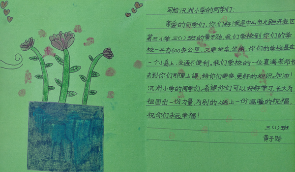 倡議得到全體師生的支持,同學們很快就送來了很多書信、賀卡和繪畫等作品。他們都說很想跟遠在饒平的同學們成為好朋友,互相幫助,互通有無,也希望饒平汛洲小學的同學們可以來中山做客。
