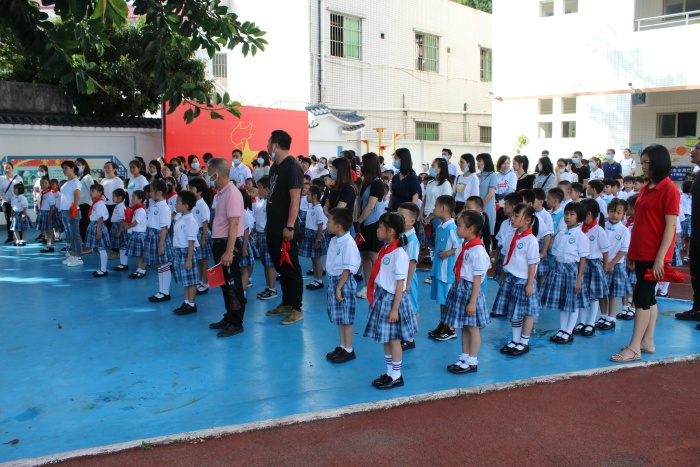 5月26日上午,在黨支部書記胡冬梅的帶領(lǐng)下,全體新隊(duì)員們排著整齊的隊(duì)伍,在家長的陪同下來到學(xué)校大榕樹下,入隊(duì)儀式在雄壯有力的出旗中拉開了序幕。隨后,全體新隊(duì)員高唱《中國少年先鋒隊(duì)隊(duì)歌》,鏗鏘嘹亮的歌聲唱出了隊(duì)員們的信心和決心。在鮮艷飄揚(yáng)的隊(duì)旗下,大隊(duì)輔導(dǎo)員阮結(jié)連老師宣布了新成立的中隊(duì)及新隊(duì)員名單。家長親自為新少先隊(duì)隊(duì)員戴上了鮮艷的紅領(lǐng)巾,新隊(duì)員們按捺不住心中的喜悅之情,滿臉興奮,迫不及待地與親人分享,并鄭重地向親人敬了隊(duì)禮。胡書記對新隊(duì)員們提出了新的希望和要求,勉勵(lì)新隊(duì)員要用實(shí)際行動(dòng)爭當(dāng)一名好好學(xué)習(xí)、好好鍛煉的新時(shí)代好隊(duì)員。