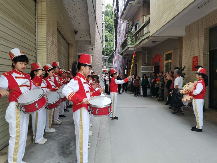 活動(dòng)伊始,開(kāi)發(fā)區(qū)五小鼓號(hào)隊(duì)的全體隊(duì)員穿著整齊的隊(duì)服,排著有序的隊(duì)伍,跟隨著村書(shū)記來(lái)到了新兵的家里。一路上,鼓號(hào)隊(duì)隊(duì)員奏響了振奮人心的進(jìn)行曲,引來(lái)了村民和路人的觀(guān)望。隨后,隊(duì)員代表為各位新兵及其家屬佩戴大紅花,最后,鼓號(hào)隊(duì)隊(duì)員用嘹亮的鑼鼓聲把新兵送到社區(qū),由村書(shū)記為新兵送上入伍紀(jì)念禮物。盡管路途比較遠(yuǎn),但是全體鼓號(hào)隊(duì)員仍然保持良好的精神狀態(tài),一直堅(jiān)持到最后。