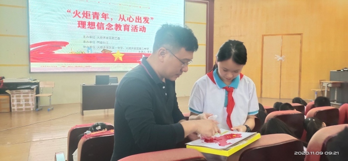 2020年是中國(guó)少年先鋒隊(duì)建隊(duì)71周年,為了進(jìn)一步激發(fā)新時(shí)代少先隊(duì)員、共青團(tuán)員的愛國(guó)熱情,樹立遠(yuǎn)大理想,培養(yǎng)優(yōu)良品德,積極踐行社會(huì)主義核心價(jià)值觀,11月9日下午,由開發(fā)區(qū)團(tuán)工委主辦、同益社工承辦的“火炬青年,從心出發(fā)”理想信念主題教育活動(dòng)在火炬二中學(xué)術(shù)報(bào)告廳順利開展。