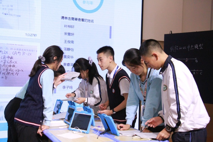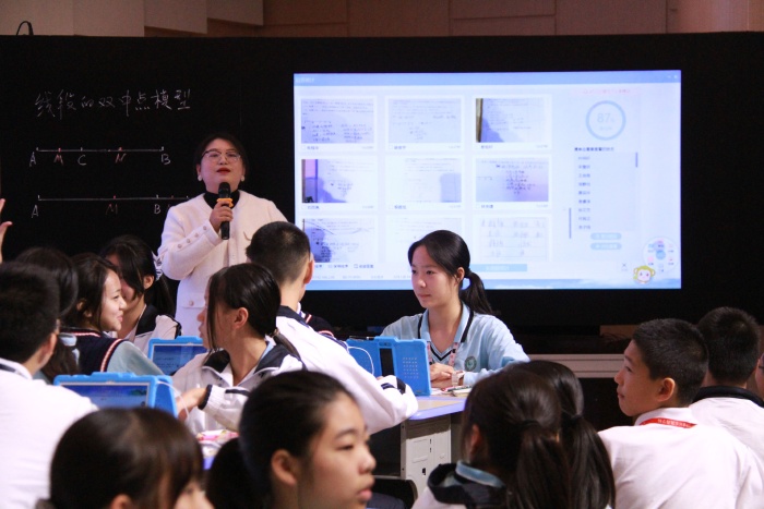 大家移步到一樓報告廳時,今天一襲白衣,顯得格外溫柔的陳盼老師帶著八班的同學(xué)們已經(jīng)整齊坐好。陳盼老師組織同學(xué)們先用洋蔥學(xué)院進(jìn)行了課前預(yù)習(xí),通過智慧平板在課前進(jìn)行作業(yè)訂正和組內(nèi)答疑,讓學(xué)生對雙中點模型有了初步的印象。課中,使用Geogebra(動態(tài)幾何畫板)進(jìn)行展示,幫助學(xué)生了解雙中點模型。陳老師特別注重小組合作,簡單的題或知識點采用小組合作采用對學(xué)的模式,難度較高的則采用群學(xué)的模式,充分發(fā)揮小組的力量。同時使用智慧教育平臺,學(xué)生通過平板拍照上傳小組探討結(jié)果,老師及時收集數(shù)據(jù)、反饋答題結(jié)果,據(jù)此組織教學(xué)重點。班上的小小老師,上臺展示時,講解清晰,絲毫不怯場,也讓人眼前一亮!數(shù)學(xué)課其實也可以有很多互動,陳老師與八班的孩子們優(yōu)秀地展示了紀(jì)雅的教學(xué)特色:基于智慧教育初中課堂小組合作學(xué)習(xí)”的教育教學(xué)模式。