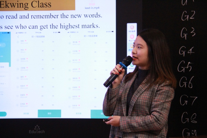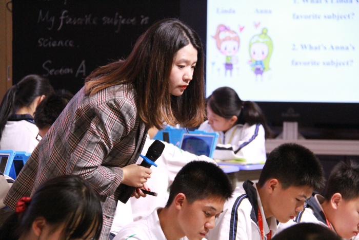 首先初一(7)班同學(xué)們齊聲面對大家先說了自己班級口號。下面的課程中,就不再聽到大家說中文了,真正做到英語課就從一始終用英文來交流。在課前的預(yù)習(xí)任務(wù)中,黎老師使用翼課網(wǎng)布置讀記單詞任務(wù),看誰識記最快。(所有上課任務(wù)都是實行加分的)上課開始,黎老師展示了學(xué)習(xí)目標(biāo)。而這堂課的內(nèi)容是:我最喜歡的學(xué)科和老師,所以先展示了同學(xué)們熟悉的各任課老師說英語的視頻,并用任課老師生活照片來提示大家用英文說科目名稱,讓學(xué)生一下就能融入學(xué)習(xí)任務(wù)與環(huán)境中。課中使用智慧課堂平臺發(fā)送(聽力)練習(xí)或發(fā)送做題任務(wù),學(xué)生拍照上傳答案,及時反饋做題結(jié)果,提高了課堂練習(xí)的效率。黎老師同樣十分注重小組合作,給學(xué)生創(chuàng)造語境,讓學(xué)生小組交流,兩人對話展示,說說自己最喜歡的科目與老師,以及理由??匆曨l,了解班上其它同學(xué)喜歡哪一位老師與科目。接著以小組合作的形式進(jìn)行語言輸出,互相交流做調(diào)查,并選擇代表展示全組交流結(jié)果。不僅達(dá)到了本節(jié)課教育目標(biāo),同樣體現(xiàn)了學(xué)校特色,為英語課堂的技術(shù)融合提供了經(jīng)驗。7班、8班的孩子們在退場時,都能做到安靜、有序、有禮貌,體現(xiàn)了紀(jì)雅學(xué)子的素養(yǎng)。