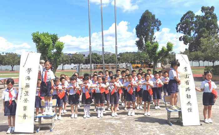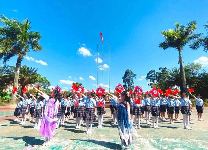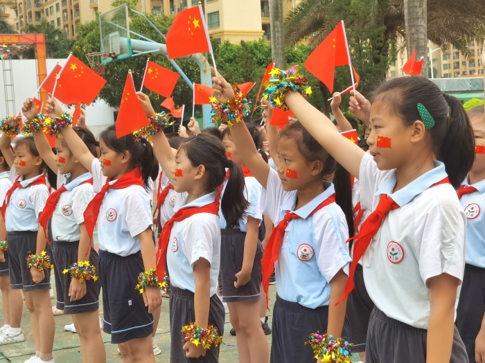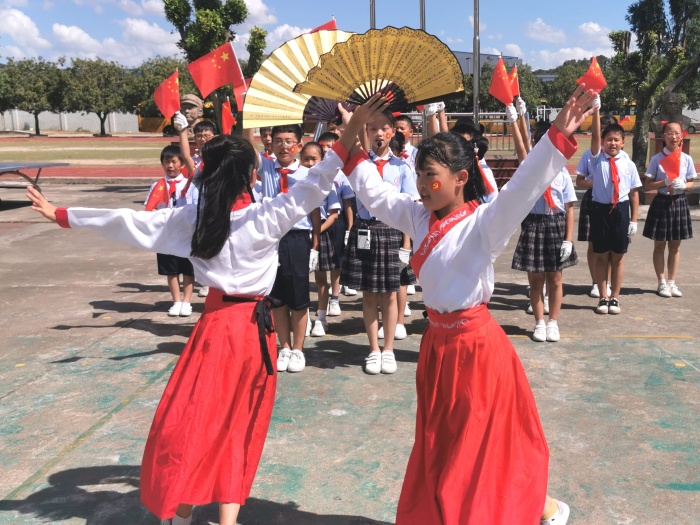 “今天是你的生日,我的中國……”“五星紅旗迎風(fēng)飄揚(yáng),勝利的歌聲多么響亮……”“道可道,非常道;名可名,非常名......”伴隨著悠揚(yáng)的旋律,同學(xué)們揮舞著國旗、黨旗,或歌或舞,或吟或誦,或書或畫,用不同形式抒發(fā)對祖國的美好祝福和對經(jīng)典詩文的無限熱愛?!绑A旅客逢梅子雨,池亭人挹藕花風(fēng)?!表嵚蓛?yōu)美的《笠翁對韻》,一組對詞就是一句念白,一副對子就是一段唱腔,妙不可言,同學(xué)們在誦讀中不知不覺掌握對仗用韻,學(xué)會遣詞造句,奠定了國學(xué)根基。朗朗上口的《三字經(jīng)》《千字文》《弟子規(guī)》節(jié)奏明快,更匯集古代圣賢思想,同學(xué)們在誦讀中傳承著少年養(yǎng)志、知書達(dá)理的中華文明。
