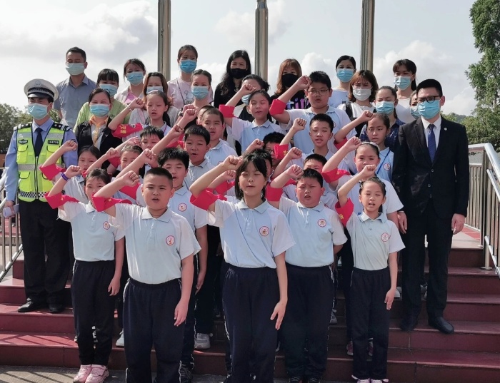 4月13日上午,新苗學(xué)校與火炬開發(fā)區(qū)交警大隊(duì)聯(lián)合舉行了“校園小交警”宣誓儀式并召開了“小交警”家長(zhǎng)會(huì)?;鹁骈_發(fā)區(qū)交警大隊(duì)吳滿權(quán)警官、新苗學(xué)校校長(zhǎng)鄒麗、副校長(zhǎng)段岳華、德育主任黃俊、中山市交通安全宣傳義工周景輝律師、新苗學(xué)校22名“小交警”及其家長(zhǎng)參加了此次活動(dòng)。德育處黃俊主任主持宣誓儀式。