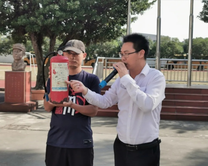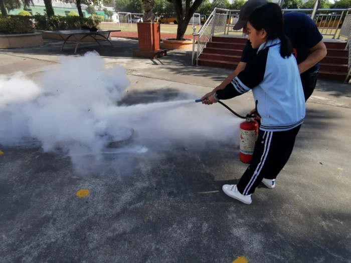 負(fù)責(zé)安全的俞希金老師非常仔細(xì)的向在場師生講解干粉滅火器的使用方法:“把滅火器罐上下晃動(dòng)三次以上,將安全梢拉開,握住出粉皮管,將皮管朝向火點(diǎn),距離火點(diǎn)2米左右用力壓下把手,對準(zhǔn)火苗根部噴射。”大家都牢牢記住了滅火器的使用方法“一搖、二拔、三噴”。隨后老師手把手的教學(xué)生使用干粉滅火器,滅火成功后,學(xué)生們臉上洋溢著成功的喜悅。
