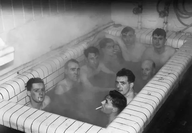 基本的淋浴、餐飲、按摩等自然準(zhǔn)備萬全,泡澡的需求也必須得到滿足。從很多年前開始,英格蘭球員們比賽過后泡個澡,順便喝點(diǎn)香檳或者抽點(diǎn)煙就已經(jīng)成為慣例,那個時候的球員集體浴缸往往是這樣的: