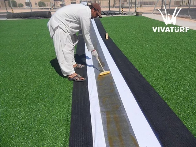 人造草坪在拼接過(guò)程中掌握好膠水粘接時(shí)間,防止草坪粘接劑因長(zhǎng)時(shí)間未粘合而固化,草坪鋪裝方向保持一致。