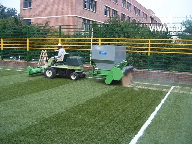 4.填充石英砂與橡膠顆粒,將石英砂填注到人造草坪里,用梳理機(jī)梳理草絲,若梳理不了,則采用人工梳理草絲,確保石英砂填充平整,并用相同的方法填充橡膠顆粒。石英砂與橡膠顆粒的注入,可以使草絲直立并增加運(yùn)動(dòng)者的舒適感。
